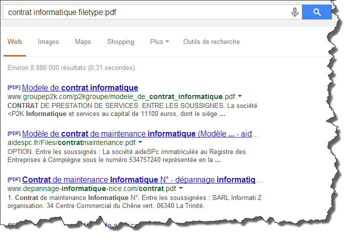 Par exemple, si vous êtes à la recherche de contrats informatiques sous forum de PDF, vous pouvez effectuer la recherche suivante :