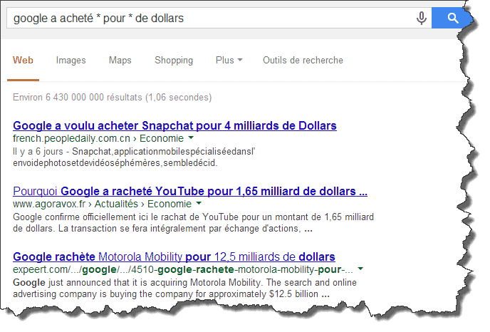 L’astérisque (*) peut être utilisé comme un caractère générique pour remplacer un mot un ou chiffre. Par exemple, si vous voulez trouver quelles sont les entreprises achetées par Google et pour combien, vous pouvez utiliser la requête suivante :