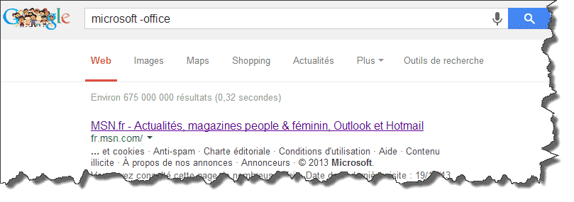 Vous souhaitez effectuer une recherche sur Microsoft, mais vous ne voulez pas que les résultats parlant d’Office apparaissent ? À ce moment-là vous pouvez effectuer une recherche en utilisant le signe moins qui vous permet de spécifier les mots qui ne doivent pas apparaître dans vos résultats. Par exemple