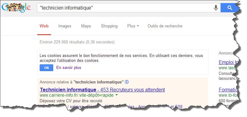 On commence par la base, l’une des fonctions les plus connues. Cela consiste à utiliser les guillemets pour rechercher une expression exacte. Par exemple avec la recherche « Technicien informatique » la recherche sera exécutée uniquement sur Technicien informatique et non-Technicien en Informatique par exemple.