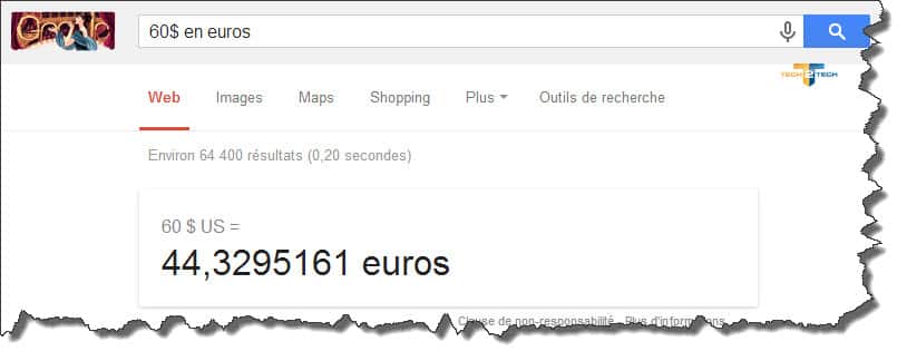 Vous êtes trop flemmard pour utiliser la calculette Windows, Linux ou Mac ? Et bien Google fera l’affaire. Vous pouvez utiliser les symboles +, -, *, / pour créer vos opérations arithmétiques. Et vous pouvez même utiliser les parenthèses pour des calculs un peu plus complexes. Automatiquement, une calculatrice apparaitra dans votre résultat Google par exemple :